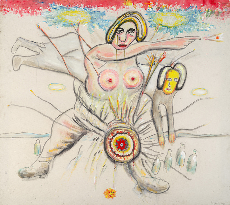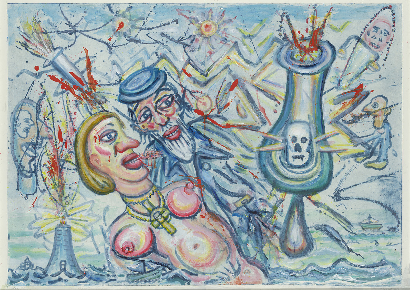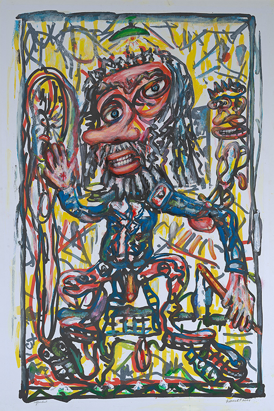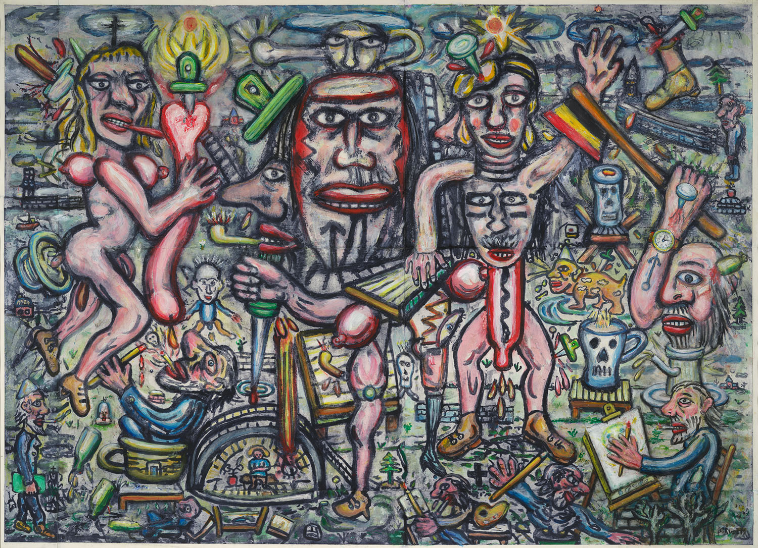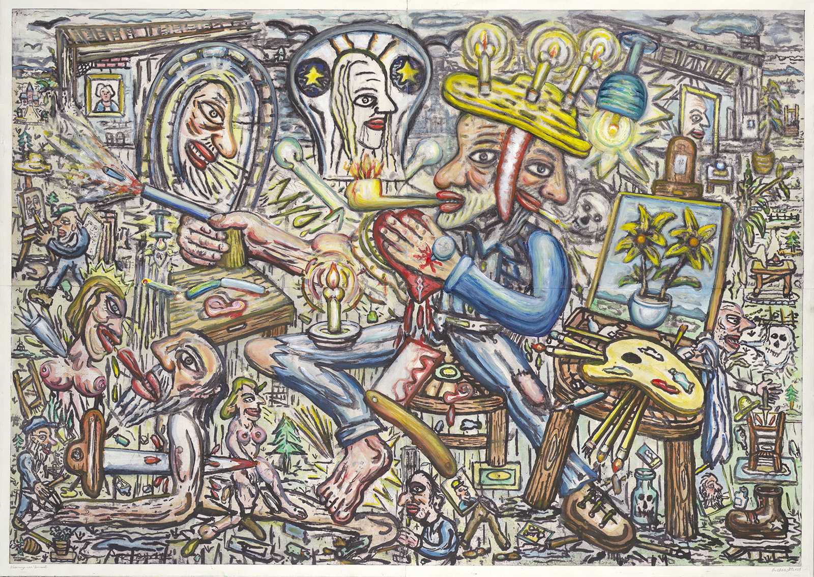 (…) Survoltage en charge blijken aan een diepdramatische noodzaak te beantwoorden; ze zijn er niet louter als picturale retoriek. (…) Zijn kunst vertoont de verkleefdheid aan het lijfelijke: een défilé van lijven, lichaamsdelen, geslachtsorganen, viscerale ingrediënten, karkassen en karikatuurwezens. Aan een darmenensemble heeft hij menige kompositie opgehangen. Niet alleen darmen, maar ook worsten, navelstrengen en serpenten zijn legio, vaak een onontwarbare serpentine vormend. Een hedendaagse Laocoön? Dit aspekt verwijst een naar de eeuwige groeikracht en wenteling, het dynamische en zelfs infernale bij deze taboebestormende, stoomaflatende kunstenaar.”
