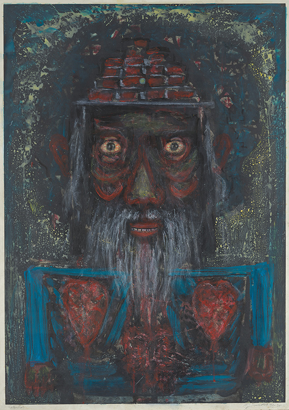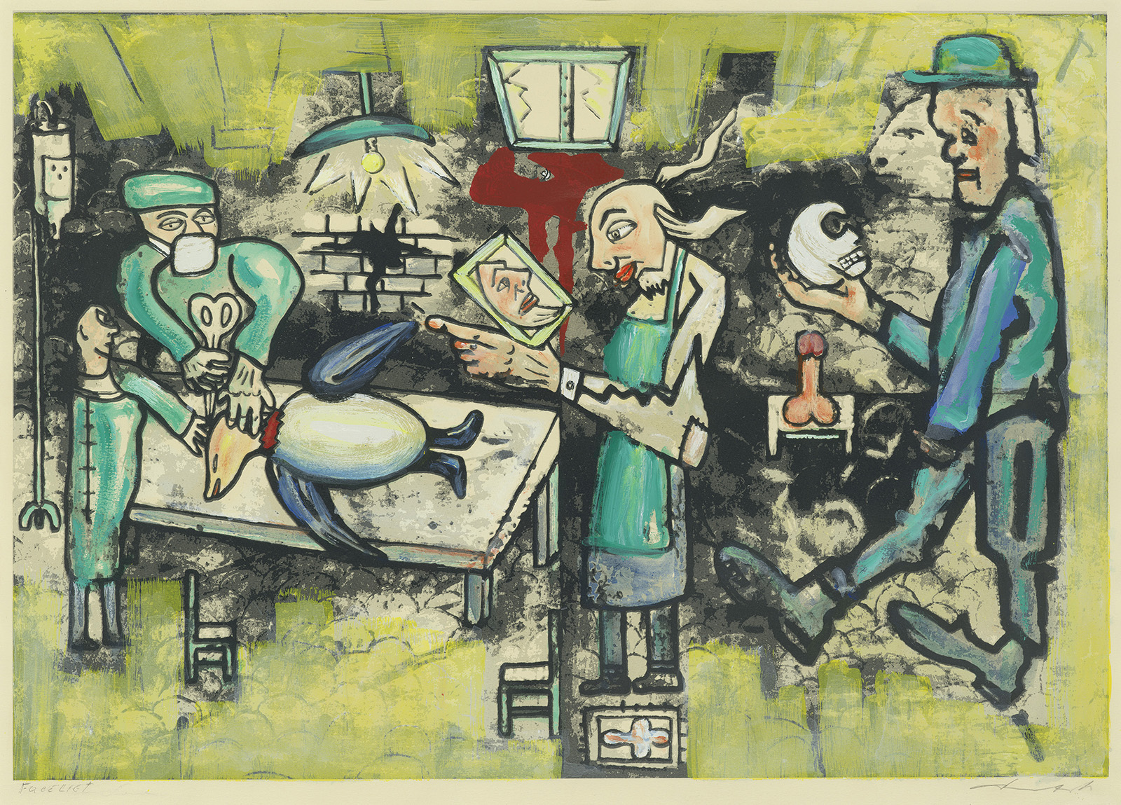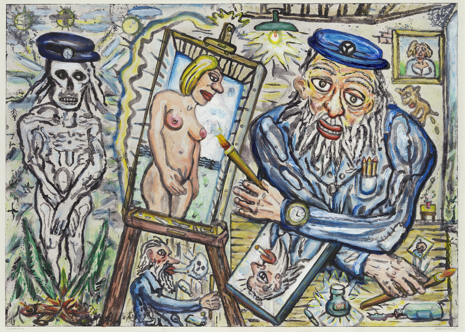 “Deze nu eens nachtmerrieachtige, dan weer uilenspiegelige figuur heeft de kwelling en de hypertensie van deze even vitale als verkrampte tijd geschilderd en geëtst met een zotskap op, maar met een gesel in de hand. (…) Vandaar zijn wereld met parende, barende, ruziemakende, smoelentrekkende, elkaar bekampende of kwellende, kwijlende, zich in scatologische toestanden wentelende lieden! Zij vieren feest en pesten elkaar tot in het uitzinnige. De wereld wordt een zelf gekozen concentratiekamp. Hun geliefkoosde attributen liegen er niet om! Er wordt aardig wat gespoten, ineengedrukt, gekerfd en gezaagd. Net wespen die onder een omgekeerd glas elkaar verdringen en tevergeefs naar een uitweg zoeken. (…) De wereld van dit vulkanisch talent is er een van tomeloze energie, gewelddadige obsceniteit, walg en waanzin, zwarte humor, maar met hier en daar een sprankel vriendschap en liefde. We bevinden ons in de baarmoeder van een wriemelend en kolkend universum, met bevreemdende metamorfoses, in een barokke montage en een theatrale enscenering. Hoe kan het anders dat het werk van deze gekwelde voor velen schokverwekkend is!