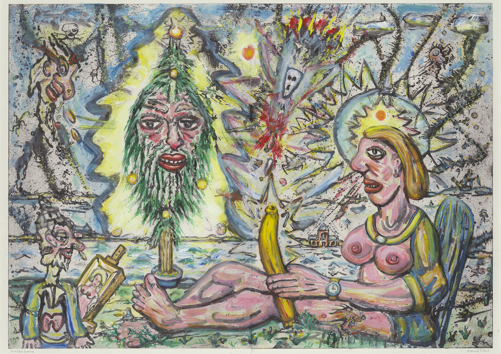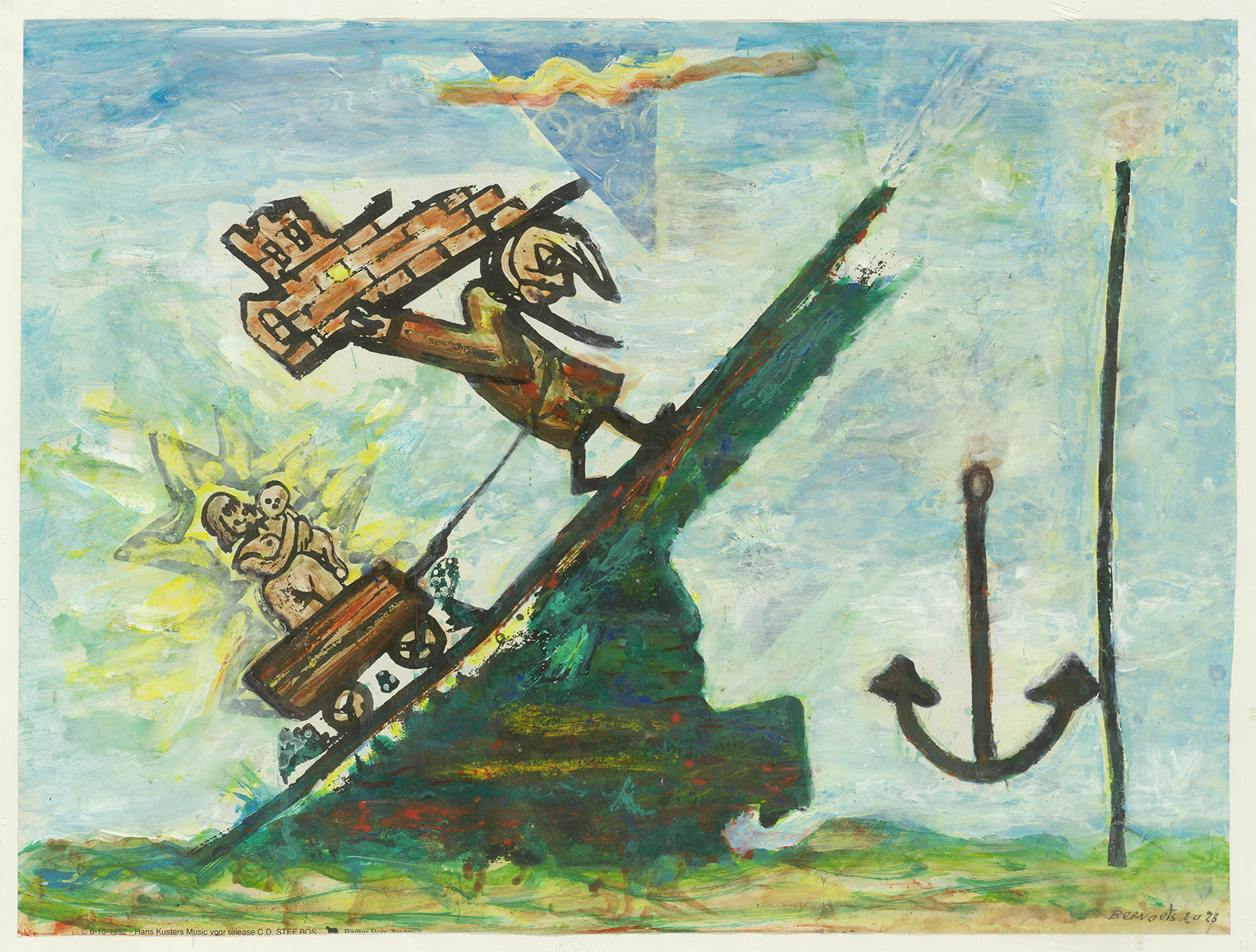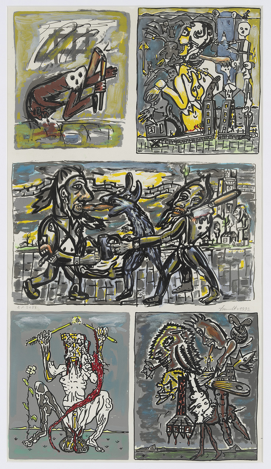 “Deze nu eens nachtmerrieachtige, dan weer uilenspiegelige figuur heeft de kwelling en de hypertensie van deze even vitale als verkrampte tijd geschilderd en geëtst met een zotskap op, maar met een gesel in de hand. (…) Vandaar zijn wereld met parende, barende, ruziemakende, smoelentrekkende, elkaar bekampende of kwellende, kwijlende, zich in scatologische toestanden wentelende lieden! Zij vieren feest en pesten elkaar tot in het uitzinnige. De wereld wordt een zelf gekozen concentratiekamp. Hun geliefkoosde attributen liegen er niet om! Er wordt aardig wat gespoten, ineengedrukt, gekerfd en gezaagd. Net wespen die onder een omgekeerd glas elkaar verdringen en tevergeefs naar een uitweg zoeken. (…) De wereld van dit vulkanisch talent is er een van tomeloze energie, gewelddadige obsceniteit, walg en waanzin, zwarte humor, maar met hier en daar een sprankel vriendschap en liefde. We bevinden ons in de baarmoeder van een wriemelend en kolkend universum, met bevreemdende metamorfoses, in een barokke montage en een theatrale enscenering. Hoe kan het anders dat het werk van deze gekwelde voor velen schokverwekkend is!