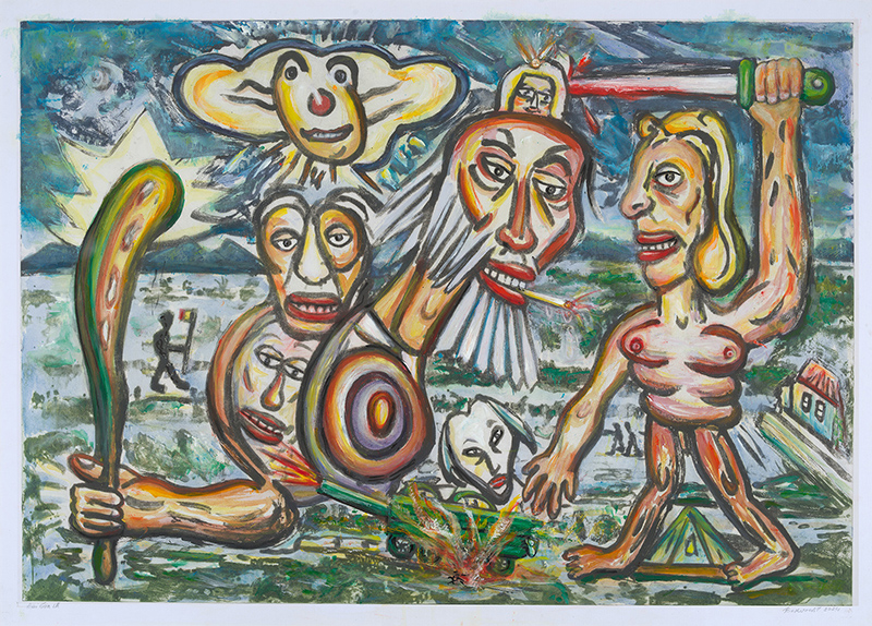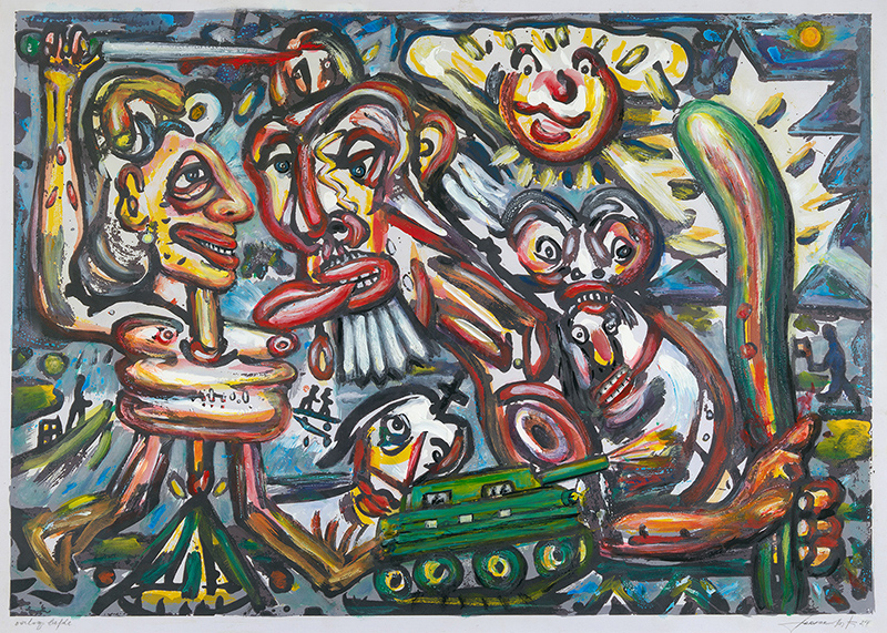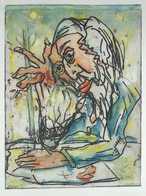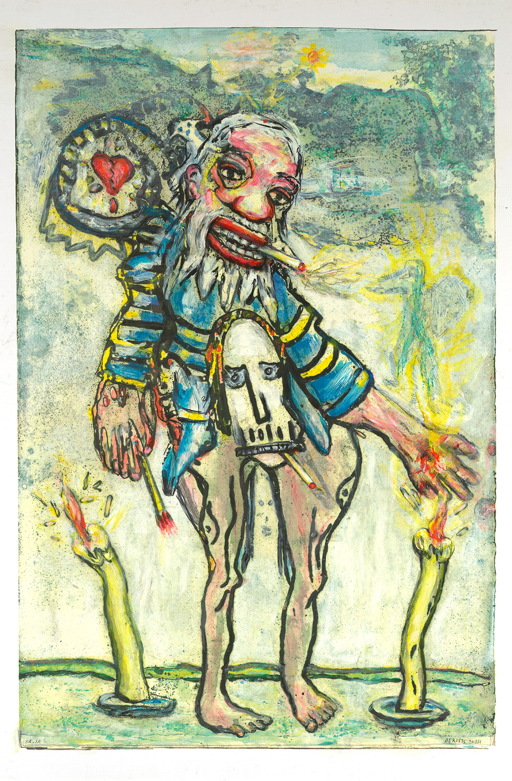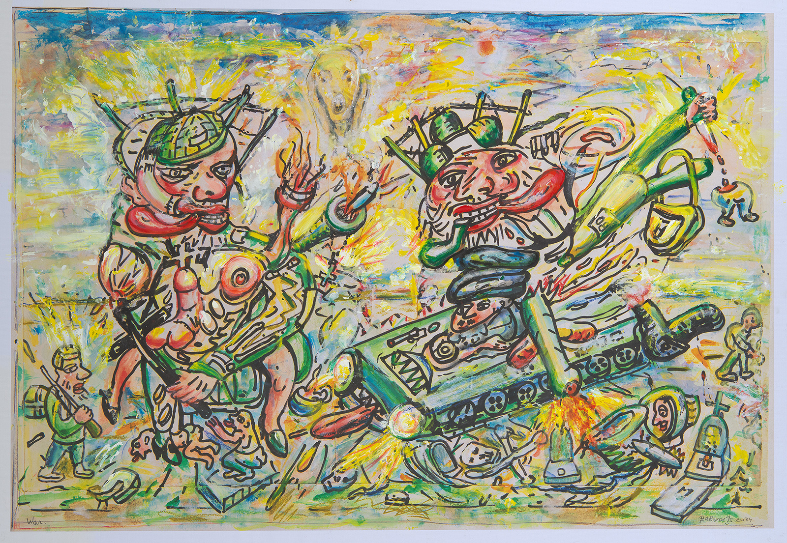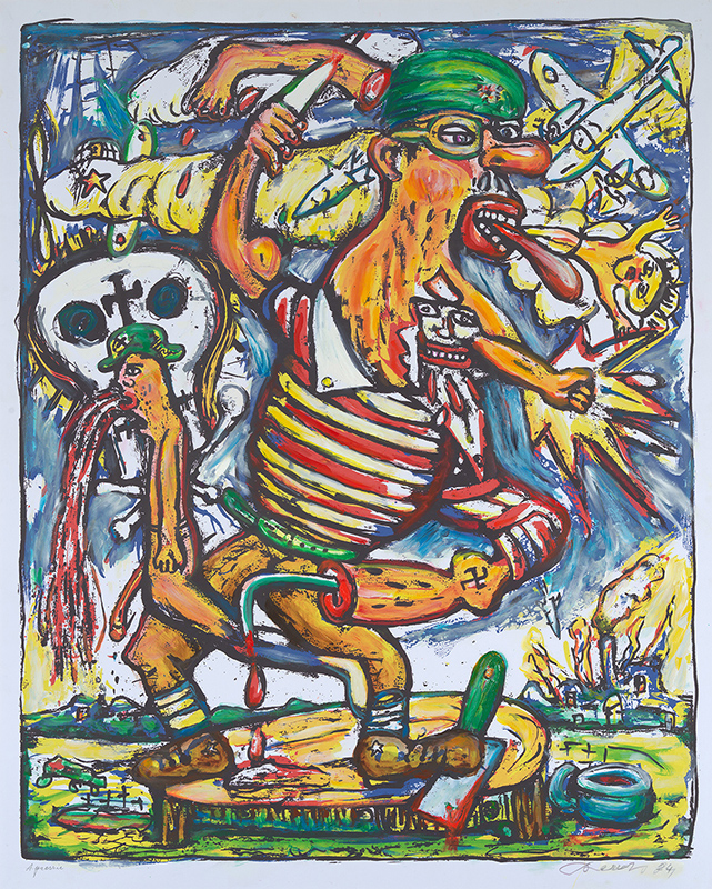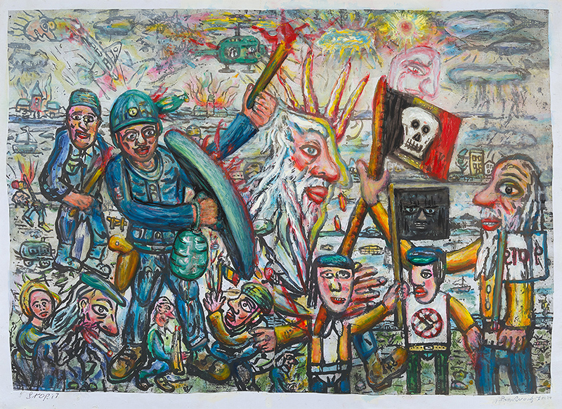 En in de huidige tentoonstelling in de galerie van bijgekleurde etsen en prints, worden we ook geconfronteerd met legertoestanden en de oorlog, een actueel gebeuren aan de grenzen van Europa. Enkele titels illustreren dit: War, It’s still war, Stop it, Verwoeste Stad, Koppijn. Als compromisloos kunstenaar zoekt Fred Bervoets in deze expo de confrontatie met onze verwarde tijd op. It’s a long way to … Het is een lange weg naar vrede en rust …