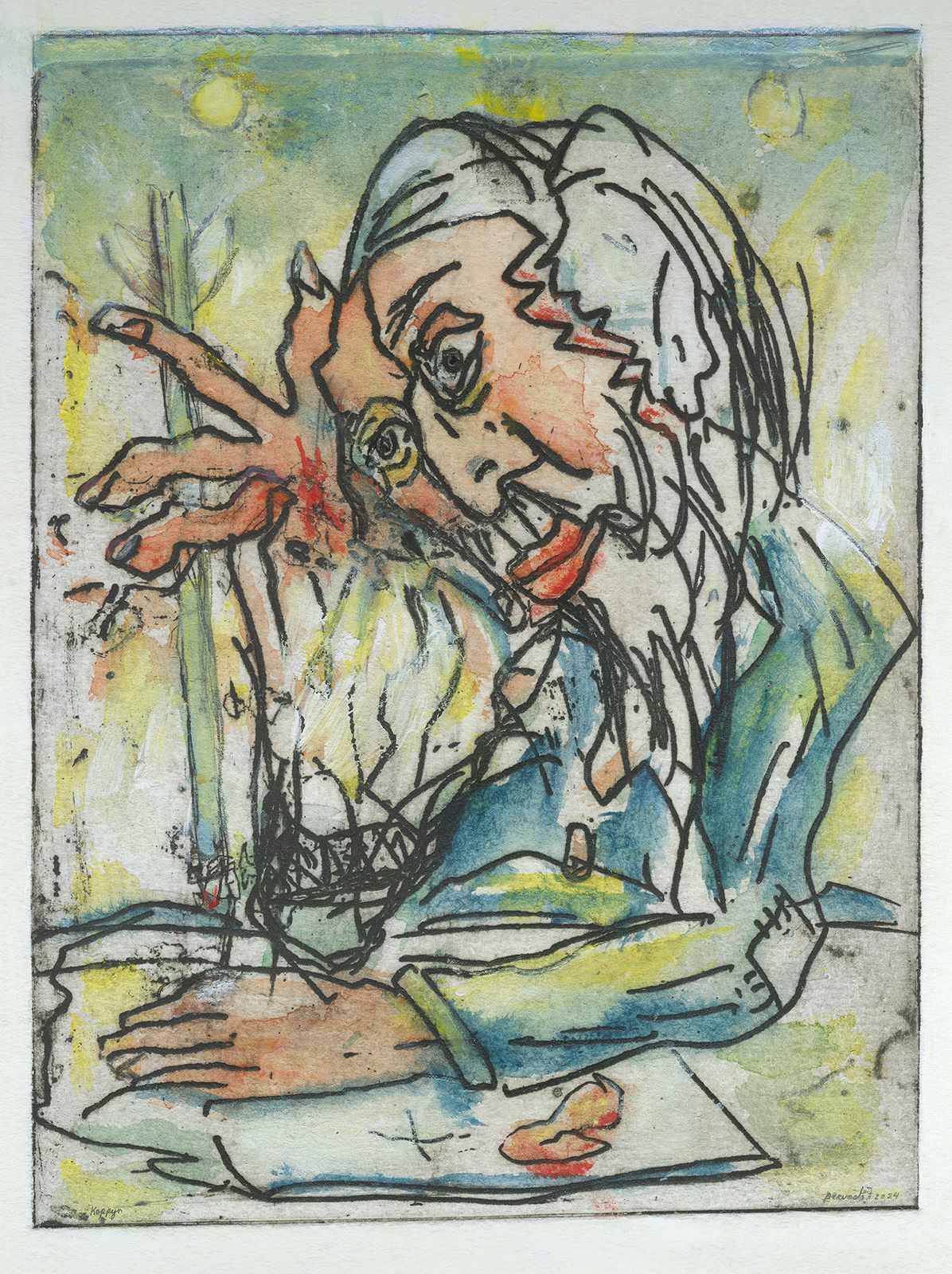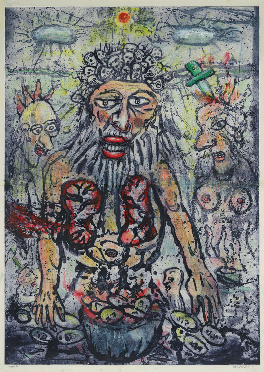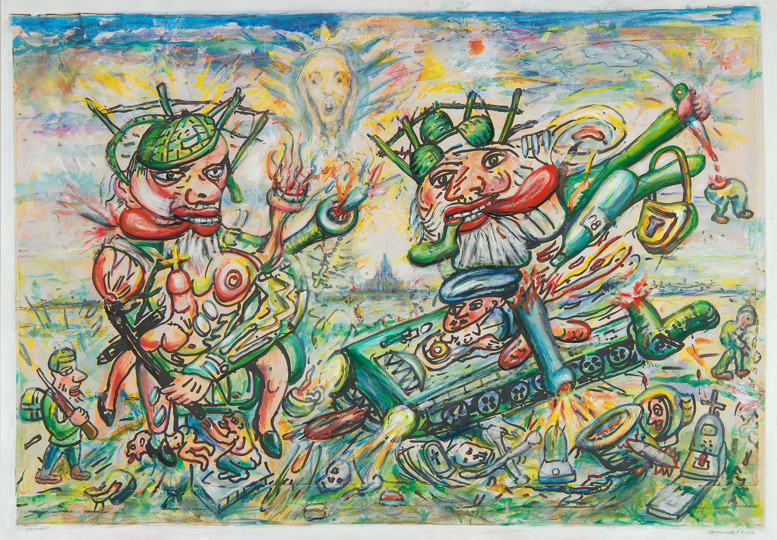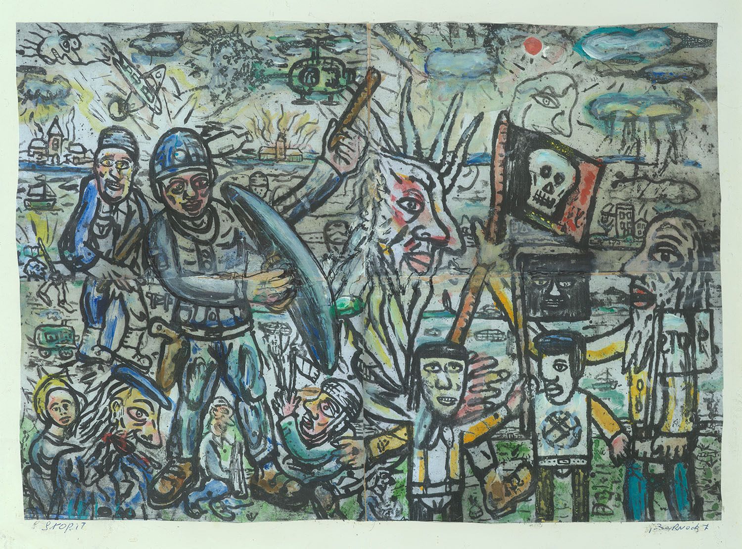 En in de huidige tentoonstelling in de galerie van bijgekleurde etsen en prints, worden we ook geconfronteerd met legertoestanden en de oorlog, een actueel gebeuren aan de grenzen van Europa. Enkele titels illustreren dit: War, It’s still war, Stop it, Verwoeste Stad, Koppijn. Als compromisloos kunstenaar zoekt Fred Bervoets in deze expo de confrontatie met onze verwarde tijd op. It’s a long way to … Het is een lange weg naar vrede en rust …