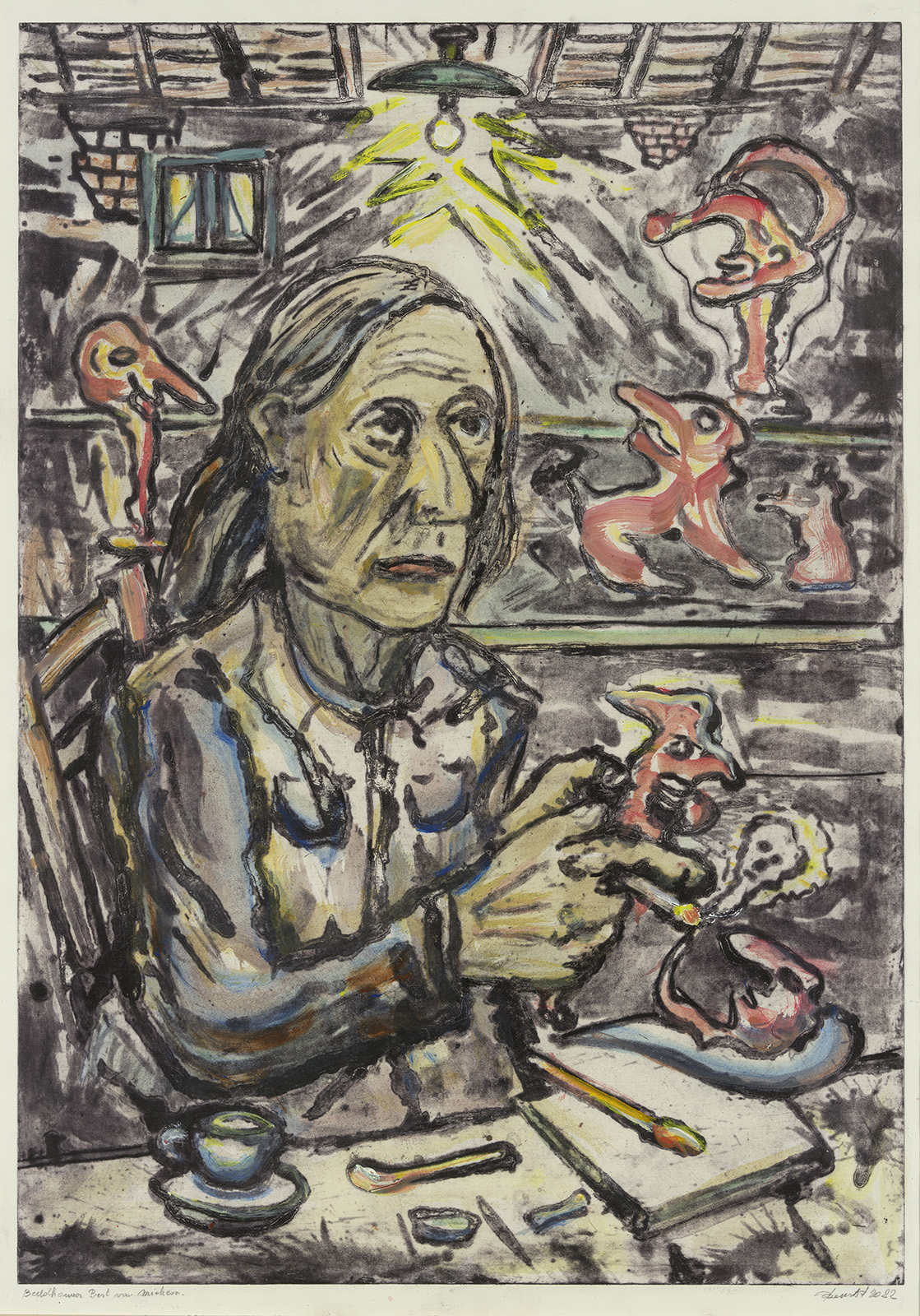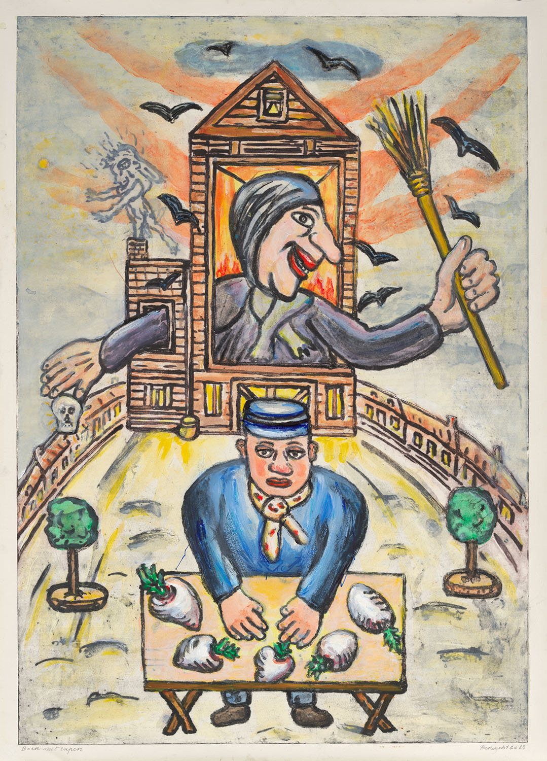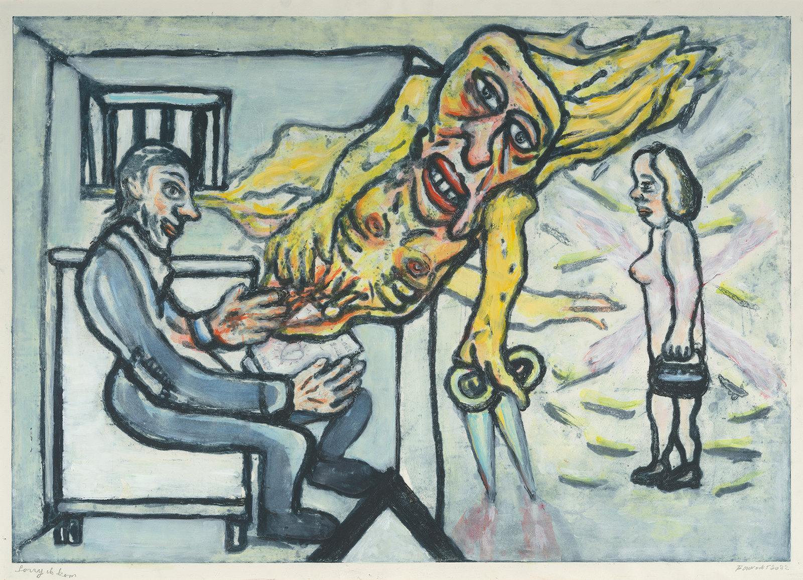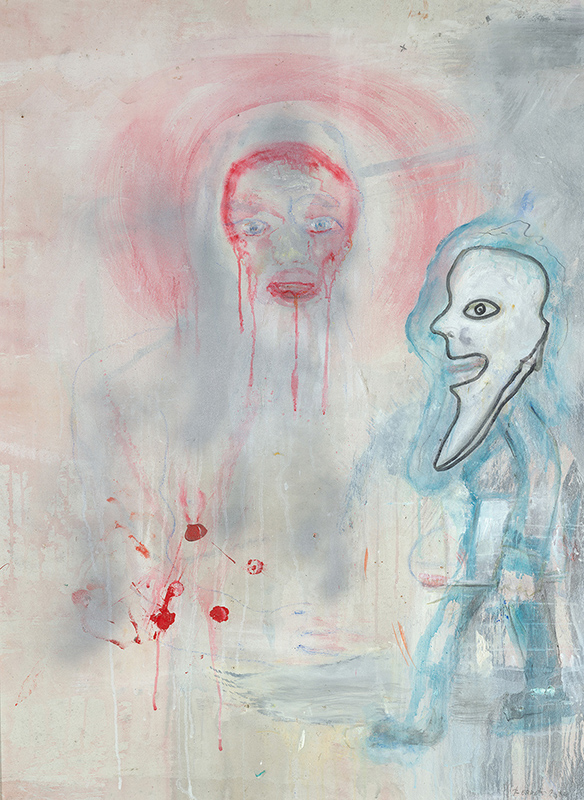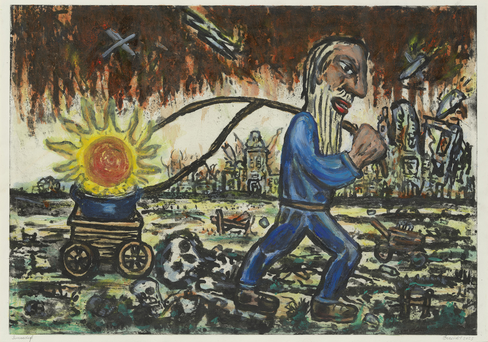 En in de huidige tentoonstelling in de galerie van bijgekleurde etsen en prints, worden we ook geconfronteerd met legertoestanden en de oorlog, een actueel gebeuren aan de grenzen van Europa. Enkele titels illustreren dit: War, It’s still war, Stop it, Verwoeste Stad, Koppijn. Als compromisloos kunstenaar zoekt Fred Bervoets in deze expo de confrontatie met onze verwarde tijd op. It’s a long way to … Het is een lange weg naar vrede en rust …